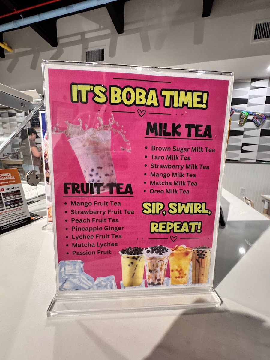 Green tea, mango juice and mango pieces with tapioca or popping boba.